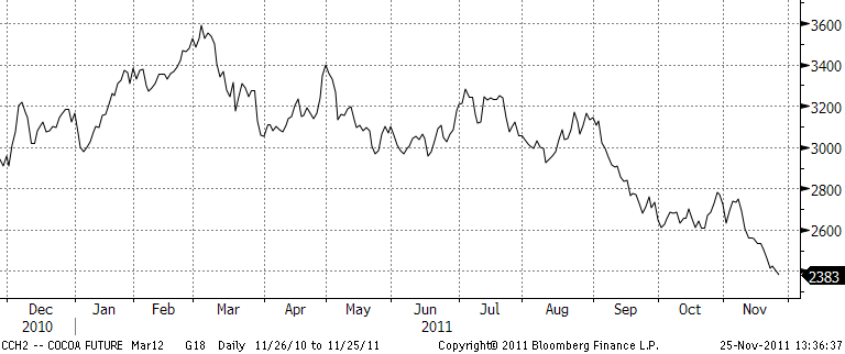Kakaopriset har under veckan handlats på årslägsta under 2400 USD/MT, en nedgång med 35 procent sedan mars, detta på bl. a. signaler om goda tillgångar från Ghana och Elfenbenskusten. Den europeiska oron verkar spela en central roll för investerare som är mer avvaktande med råvaruplaceringar och söker sig istället till dollarn och obligationer. Ett globalt överskott på kakao och det svaga ekonomiska läget i världen håller efterfrågan nere och gör handlare mindre köpsugna, därför tror vi att kakaopriset kan fortsätta ner ytterligare något.