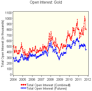 Vi har sett en osedvanligt hög korrelation mellan guldet, aktiemarknaden och råvarumarknaden denna vecka. Guldet tappade inledningsvis efter att en stärkt dollar försvagat sentimentet på guld och råvaror överlag samtidigt som man sålt guld för att täcka förluster på andra tillgångar. Senare idag kommer statistik kring de spekulativa positionerna från U.S. Commodity Futures Trading Comission som kan bringa ytterligare klarhet i frågan. Bilden nedan visar att open interest förr 4.7 procent (kommersiella aktörer netto korta och investerare minskade långa positioner med 1.9% och korta positioner med 7.3%).