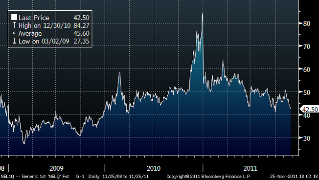 Sentimentet på basmetallerna har försvagats och utöver den svaga utvecklingen på världens börser och en stärkt dollar ser vi något svagare kinesiska siffror. Preliminära PMI siffror för november i landet landar på nivåer under 50 (index över 50 indikerar tillväxt inom industrin) och kanske så lågt som 48. Det har talats mycket om produktionsneddragningar i takt med att deflationsoron tilltar, speciellt på Nickel pig Iron (lågkostnadssubstitut till Nickel), zink och aluminium. På den senare har förvånansvärt lite dragits ned trots att vi handlar en bra bit under marginalkostnadsproduktion. Vad gäller Zink handlar vi ca 25 procent över cash-cost, Nickel 30-35 procent och på Koppar strax över 80 procent över. Nedan en bild på LME Index som tappat 3.65 procent under veckan.