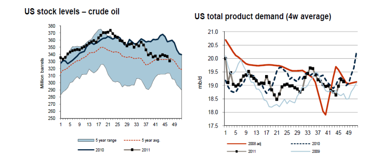 Oljepriset (Brent) föll tillbaka något under veckan trots vikande lager. Amerikanska lagersiffror minskade med totalt 3,9 miljoner fat och det var främst råoljelagren som föll (-6,2 miljoner fat mot förväntat 0,5 m fat). Merparten av fallet tillskrivs den olja som fastnat i transit i Alaska (ca 4,1 m fat) till följd av snöstormar som påverkat lastningen av fartyg. Destillat lagren ökade med 0,8 fat (förväntat -1.3 m fat) och bensin ökade med 4,5 m fat (förväntat 1.1 m fat). Efterfrågan minskade 0.7 fat ner till 18.6 fat per dag. Fyra veckors genomsnittliga efterfrågan är nu 19.1m fat per dag vilket är 0,3% lägre än samma tidpunkt förra året.