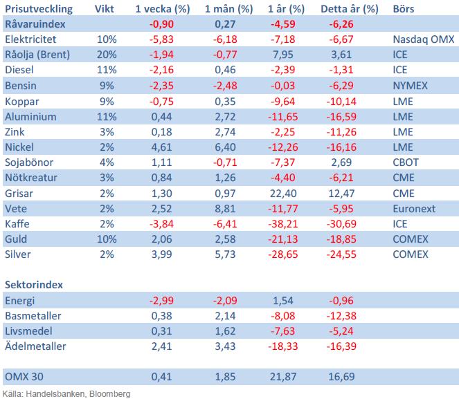 Brentpriset ser denna vecka ut att gå mot det största raset på 4 månader. Orsakerna till prisuppgången i augusti verkar nu omvänt. Lagernivåerna i USA steg under veckan oväntat mycket – i somras föll de oväntat mycket. Den politiska turbulensen i Mellanöstern har också hamnat utanför kameralinsen senaste veckorna vilket prisar ur mer av riskpremien. När elpriset dessutom har haft två svaga veckor efter väderomslag med stor nederbörd och blötare prognoser så har vårt energiindex tappat sin starka trend uppåt. Vi tror dock på en come back, främst för el i närtid.