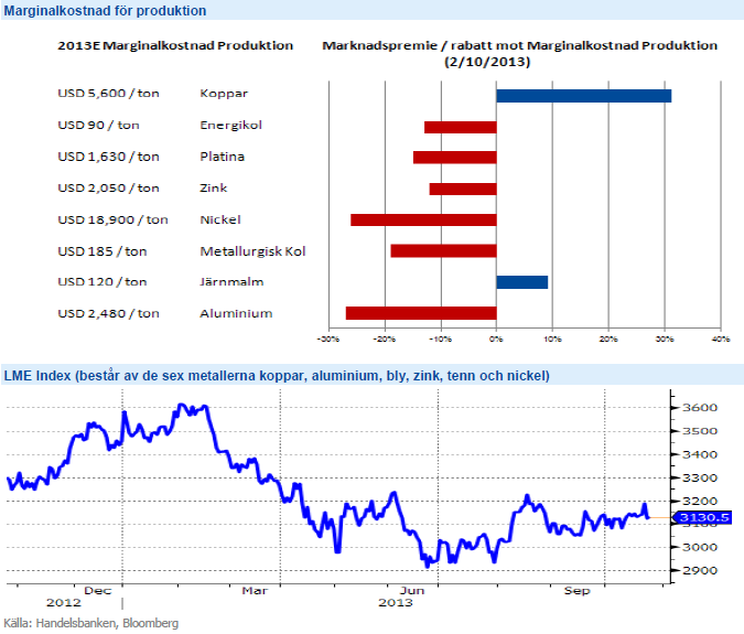 Basmetallerna har stärkts över lag under veckan, dels på grund av positiv PMI-flash från Kina, och vi tror på en fortsatt stark höst. LME Index har stabiliserats efter sommarens bottennoteringar och vi räknar med att den positiva trenden fortsätter utan några dramatiska rörelser. Överskottet bör ha diskonterats för och läget på metaller kanske bäst illustreras genom bilden nedan där Nickel och Aluminium är de två metaller som handlas på störst rabatt sett i förhållande till marginalkostnad.