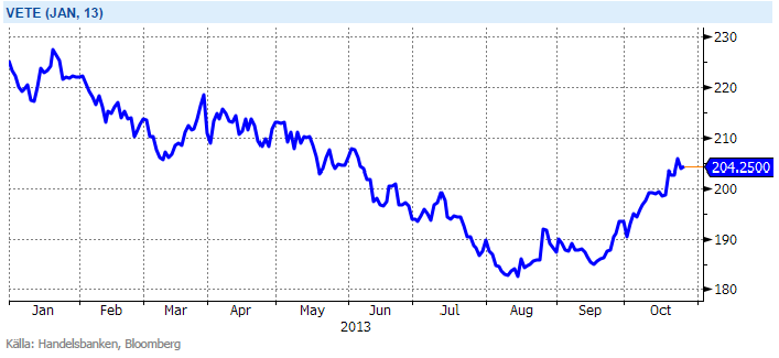 Oljepriset har fallit under veckan till följd av stigande lager (högsta nivå sedan juni) och handlas nu på 106,6 USD/fat. Oro för kortsiktigt överskott av amerikansk råolja har fått spreaden mellan WTI och Brent-olja att gå isär, som mest under veckan på dryga 11 dollar, vilket är störst sedan april. Kombinationen av växande nordamerikanska produktionen, nya rörledningar till den amerikanska gulfkusten och storskaliga revisionsstopp på raffinaderier är anledningen till att WTI-oljan handlas så mycket lägre än Brent.