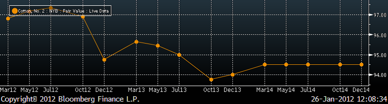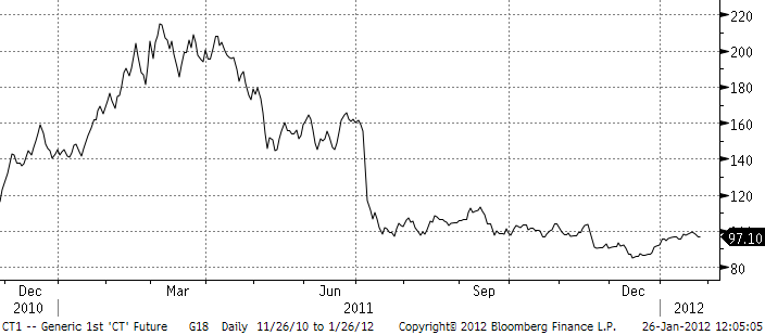 Bomullspriset har varit fortsatt stark under senare delen av januari. Vi har sett starka exportsiffror från USA. Kina och Mexico är de är de länder som ökat sin import främst. Lägre produktion i två regioner i Indien har rapporterats som följd av skadad skörd orsakad av sjukdomar. Vi ser ingen omöjlighet att priset kan bryta 100 USd/Ibs nivån om dessa sjukdomar fortsätter att sprida sig. Kina, som världens ledande bomullsproducent, väntas odla mindre plantor och därför spekuleras det att Kina kan komma att bli en stor köpare på marknaden. Just nu pågår det kinesiska nyåret så vi tror på en prisrörelse i sidledes på kort sikt.