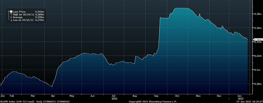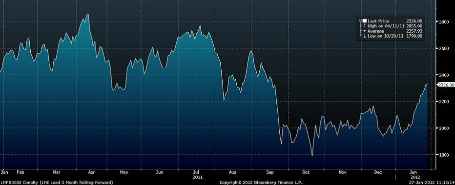 Bly är också en av de stora vinnarna som under veckan blivit 7 % dyrare, och som nu handlas på högsta nivån på fyra månader. Under 212 har metallen stärkts nästan 14 %. Kina står för 45 % av den globala konsumtionen och under 2009/2010 har prisuppgången drivits av bilproduktionen i landet, då bly används i stor utsträckning för tillverkning av batterier. En avmattning i bilindustrin har fått metallen på fall under 2011. På grund av kraftig förorening från batterifabriker i Kina skedde under 2011 inspektioner som resulterade i att många fabriker fick stänga ned. En del fabriker ökade produktionen innan inspektionen och byggde därmed upp större lager för att störningen av stängningen skulle bli så minimal som möjligt. Många har startat upp sin produktion igen med nya och mer effektiva fabriker, så produktionen bör vara tillbaka på samma nivå inom snar framtid. Vi noterar samtidigt att från oktober förra året har LME:s lager på bly minskat med 12 %. Rapporter vi tagit del av visar på ökad konsumtion av metallen i Kina medan konsumtionen i väst inte förutspås att öka. Bilderna på nästa sida visar 3-månader priset för bly på LME under 1 år samt LME:s lager ett år tillbaka.