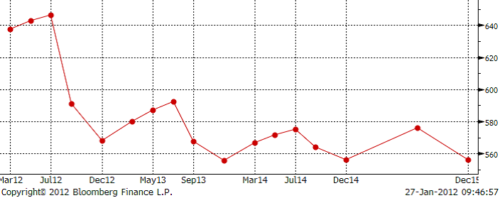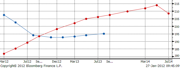 Nordpools elkontrakt för andra kvartalet, Q2 2012, steg med över 4 procent till EUR 35.40 som ett resultat av något kallare prognoser under mitten av veckan men främst till följd av högre spotpriser. Spotprisnivåer klart över förväntan oroar marknaden eftersom det är svårt att veta huruvida norska vattenproducenter lyft budkurvan mer permanent eller om det bara är tillfälligt. Vidare har utsläppsrätterna stigit kraftigt, upp 9.4% sedan i måndags på ökad efterfrågan från energibolagen vilket innebär att de nu är uppe på årshögsta. Vi har inte sett några nämnvärda rörelser på energikol under veckan men gårdagens räntebesked från USA ger ytterligare stöd åt fossila bränslen. Banken är fortsatt positiv till utvecklingen i USA för det kommande året (GDP prognos +2.6 för 2012) vilket bör driva utvecklingen av energirelaterade kontrakt vidare upp från nuvarande nivåer (köp BULL OLJA var för övrigt veckans tradingcase).