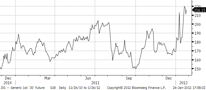 Kakaopriset har stigit 15 procent under januari som en följd av spekulationer att den globala kakaoproduktionen kan komma att falla 10 procent för säsongen som startade i oktober, jämfört med året innan. Vädret kring Elfenbenskusten fortsätter att vara varmt och torrt och skörden för säsongen ser ut att lida mot sitt slut redan, normalt brukar skördeperioden sträcka sig ända in på slutet av mars. Vi har även kunnat läsa om högre skatter från exportörerna i Västafrika. Skulle detta bli verklighet så skulle dyrare priser komma att bli ett faktum och just nu pågår diskussioner kring subventioner och andra lösningar för att hjälpa berörda i området. Vi kan mycket väl ha sett bottenpriser på kakao men det återstår att se om den ökade efterfrågan från Europa håller i sig samt hur det globala överskottet och lägre konsumtion av kakao utvecklar sig.