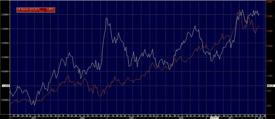 Feds besked i veckan om att hålla räntorna ”exceptionellt låga” till åtminstone slutet av 2014 (tidigare gällde detta till mitten av 2013) har skickat upp priserna på ädelmetaller denna veckan; guld med 3 %, silver med nästan 4 % och platina med 4,5 %. Feds besked sänkte räntor generellt vilket innebär att alternativkostnaden för att hålla investeringar i ädelmetaller minskar, och driver priset uppåt (se bild nedan som visar amerikansk 10-årsränta – inverterad – och guldpriset). En viss effekt av ”flykt till säkerhet” kan nog också förklara en del av prisuppgången på guldet; att Fed ser det nödvändigt med penningpolitisk lättnad tolkas som en konjunktur-oro.