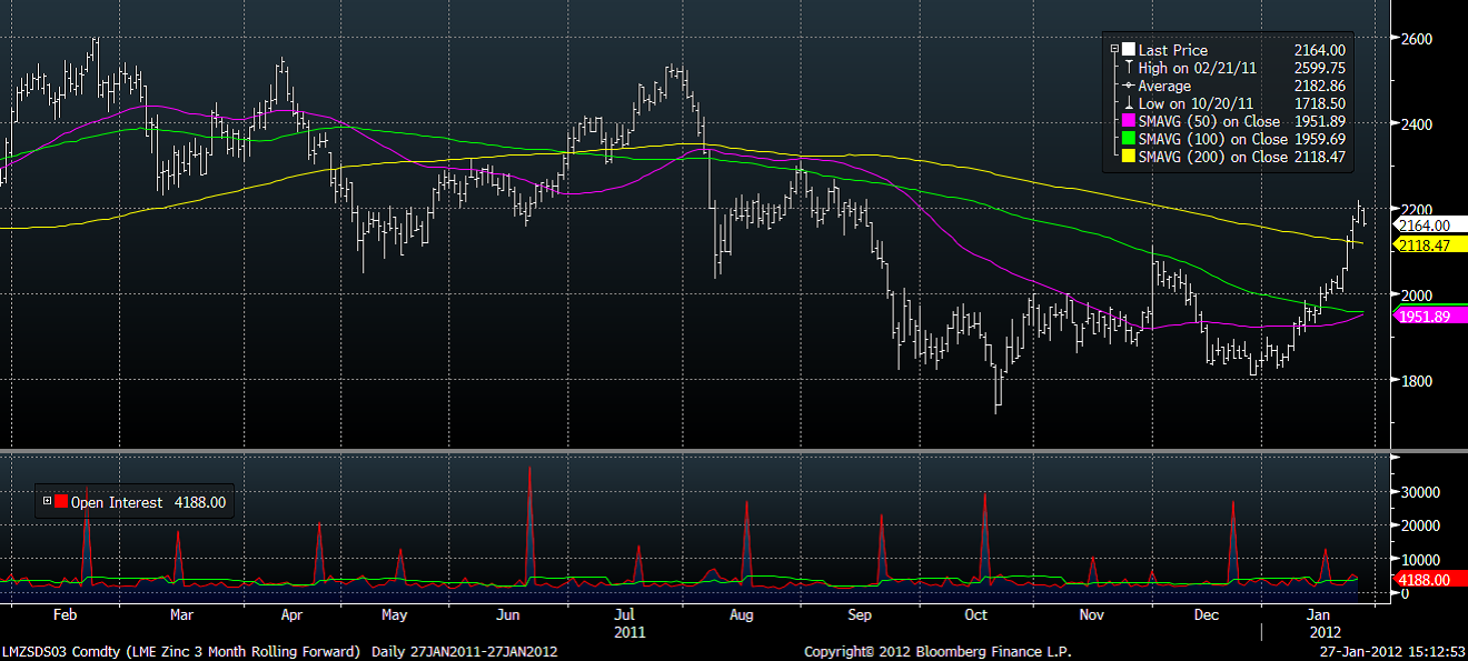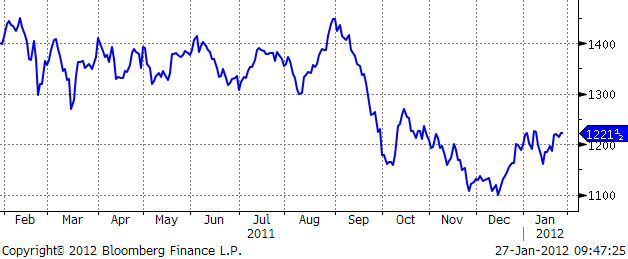 Kopparpriset har stärkts med bakgrund av en svagare dollar men även på högre importsiffror från Kina som står för den största konsumtionen. Prognos från ICSG, International Copper Study Group, visar på högre efterfrågan än utbud under 2012 vilket ger stöd åt vår positiva syn. LME:s lager på koppar fortsätter ned ytterligare 3 % denna vecka, från oktober förra året har lagret minskat med 30 % vilket hjälper till att lyfta priset. Även aluminium och nickel följer sentimentet och har stärkts med 2,5 % samt 4,8 % på fem dagar.
