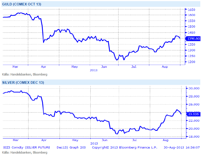 Guldet ligger i skrivande stund på samma nivå som förra veckan, 1395 dollar per uns. Förra veckan var det dock veckohögsta, denna veckan är det veckolägsta. Vi har varit uppe på 1430 dollar, drivet av John Kerrys uppskruvade retorik mot Syrien, men inga fundamentala nyheter har påverkat priset denna veckan. Vi tycker fortfarande att prisutvecklingen ser konstruktiv ut, och ligger kvar i vår positiva syn på guldet. Vi har haft 1450 som target i denna prisrörelse, och når vi dit så får vi ta en funderare på nästa steg.