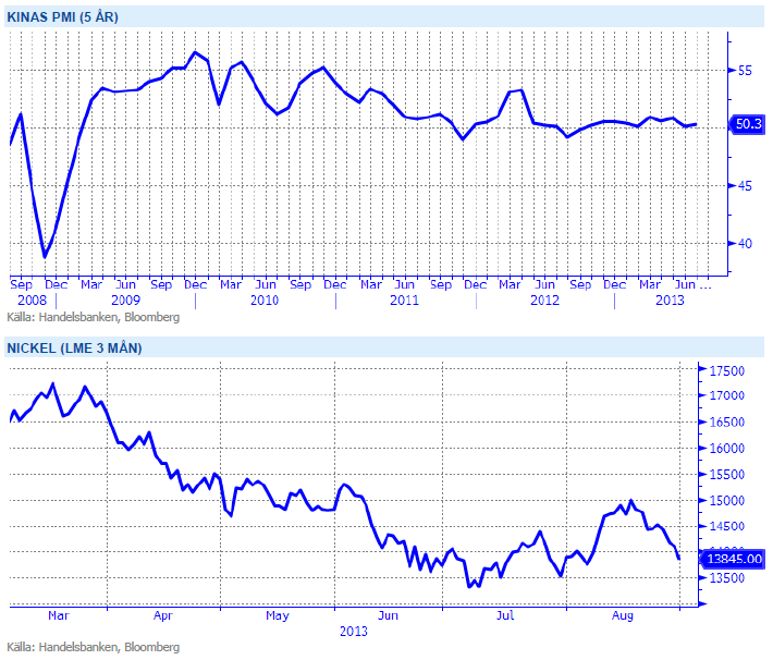 Basmetallerna har fallit något under veckan på den generella risk off rörelsen i bakvattnet av krigsrisken i Mellanöstern och som får industriella råvaror att backa medans klassiska krisindikator som guld och olja stiger. Vårt basmetallindex faller med 1,3 % där nickel återigen tar den största smällen, ner 4 %. Handelsdata, råvaruimport och flash PMI pekar all i rätt riktning för att Kinas makrodata ska kunna bli en otippad positiv överraskning under september.