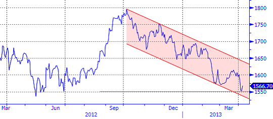 I veckan skickade vi ut ett trading case där vi följde upp vår tro på lägre guld. Under 2012 nådde guld sin högsta nivå 1794 USD/oz den 4e oktober när QE3 yran var som värst. Därefter har guldet hamnat i en fallande trend. Sedan vi initierade en handelsidé på fallande guld i mitten av februari har guldet fallit. Under mitten av mars kom dock ett trendbrott när oron kring Cypern åter väckte guldets klassiska status som en säker hamn vid oro i det finansiella systemet. Den oron har nu dragit förbi efter att risken för spridningseffekter till övriga svaga länder i Sydeuropa verkar låga.