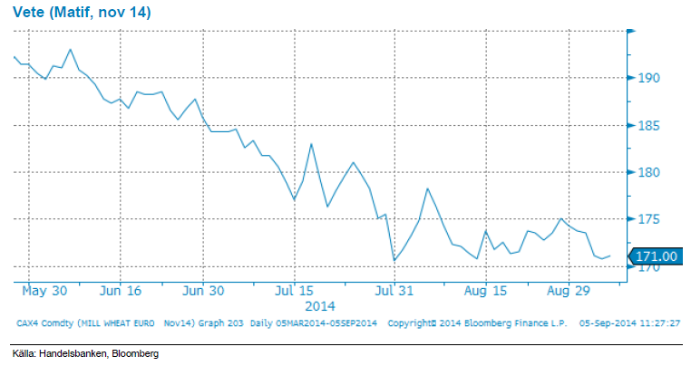 Lägre riskpremie till följd av minskad oro i Ukraina har pressat vetepriset som under veckan handlades under 170 EUR/ton (nu något högre). Även skördepress med historiskt stora majsskördar i USA sätter press på både priset på majs och vetet då båda används som djurfoder.