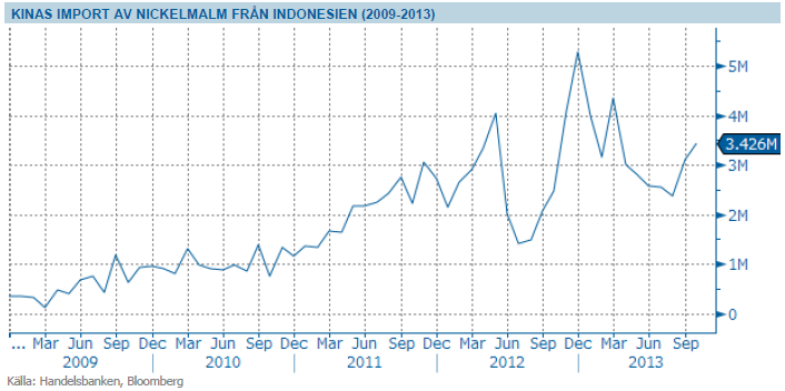 Detta har gjort att Kina importerat ännu mer nickelmalm i år för att lägga på lager, och importerat mindre nickel. Nickelpriset har även påverkats negativt av den svaga ekonomiska utvecklingen i Europa och av den pågående diskussionen om att Kina ställer om från investerings- till konsumtionsledd tillväxt. Om Indonesiens exportstopp träder i kraft som planerat, kommer Kinas lager av nickelmalm successivt att betas av och därefter bedömer vi att priserna på nickel kommer att börja stiga igen, eftersom Kina måste börja importera. Den exakta tidpunkten för detta är dock svår att fastslå. Dessutom finns en risk att Indonesien i sista stund ställer in exportförbudet, på grund av politiska påtryckningar. Sannolikheten för detta är ännu svårare att bestämma. Vår grundsyn är dock att nickelpriset bör återhämta sig under loppet av 2014, om världskonjunkturen fortsätter att förbättras och Indonesien inför exportförbud.