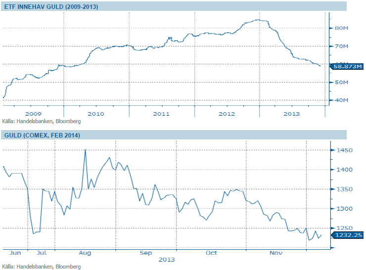 Guldet har visserligen haft en del rörelser under veckan men stänger veckan på minus återigen. Och utflödet ur guld ETF:er fortsätter. Vi hade under förra veckan hela nordens gruv- och metallindustrihöjdare i Stockholm, och har kunnat lyssna in på deras syn på marknaden för 2014. Det som stack ut när det gäller guld är att just denna metall toppat investerares intresse att placera gruvrelaterat riskkapital under 2012. Vår syn är att denna sorts investeringar görs både med eftersläpning och i flockbeteende. 2013 års prisfall på guld gör att vår gissning är att guldet inte kommer toppa tabellerna när årets investeringar summeras. Detta torde tala för ett minskat utbud av nyproducerat fysiskt guld framöver, vilket teoretiskt torde peka på att priset kan bottna ur.