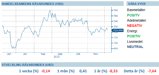 För råvaror är det generella makroklimatet gott. Vi ser ett starkt momentum i Kina, centralbanker världen över fortsätter vara superrelaxade och den generella konjunkturåterhämtningen fortsätter varför 2014 kommer bli ett bättre år för världsekonomin än 2013. Trots detta ser vi ingen stark trend uppåt bland råvarorna. Investerare har blivit mer försiktiga när man diskonterar Kinas lägre tillväxt framgent. Den tillväxt som finns blir också allt mindre tiltad mot infrastrukturella investeringar. I det korta perspektivet ser vi att lagercykeln bottnar ur och ska efterföljas av en påfyllnad med ökad import av råvaror som konsekvens.