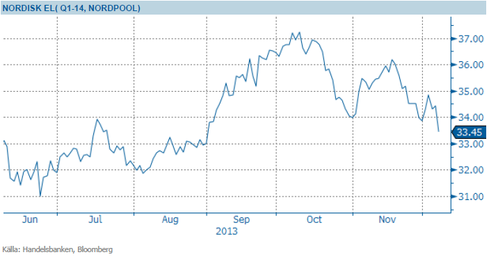 Elmarknaden som öppnade upp under inledningen av veckan försvagas mot slutet (Q1-14 når nytt all time low) och det är främst väderprognoserna som tynger sentimentet. Ett vått (ca 3TWh nederbörd över normalt) och milt (1-2 grader över normalt) scenario för hela den kommande 10-dagars perioden innebär att energiunderskottet fortsätter at minska i rask takt mot normalnivåer om det här håller i sig.