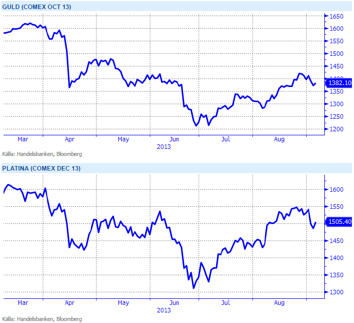 Efter dagens rykande färska arbetslöshetsstatistik från USA, nonfarm payrolls som kom in något sämre än väntat, handlar guldet på 1390 dollar per uns, att jämföra med förra fredagens 1390 dollar per uns… Veckan har präglats av små rörselser i brist på nya nyheter i Syrienfrågan och i linje med en avvaktande hållning på de flesta marknaderna. Vi bibehåller vår positiva syn på guldet i det kortare perspektivet, och vår negativa syn i det längre perspektivet. Platina har tappat marginellt under veckan som gått.