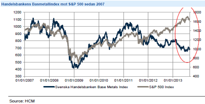 Under första halvan av året har utvecklingen på basmetaller och aktiemarknaden gått ordentligt isär, bilden nedan visar utvecklingen på Handelsbankens Basmetallindex mot S&P 500 sedan 2007. Även om amerikansk och europeisk makro signalerat återhämtning under en tid, verkar den kinesiska ekonomin varit i kontraktion fram till juli/augusti i år vilket pressat efterfrågan och priserna på metaller. De senaste veckorna har vi dock sett tecken på att den kinesiska tillväxten kan ta fart igen där några fundamentala rörelser är intressanta att notera, framför allt på koppar. Kinas kopparimport har återigen ökat och såväl inhemska som globala lager har minskat samtidigt som investerare täckt sina korta positioner. När den värsta oron för ett överutbud nu avtagit samtidigt som lagren minskar anser vi att metallpriserna bör ha bottnat ur under Q2 2013 och att en ökande efterfrågan bör resultera i högre metallpriser överlag under hösten.