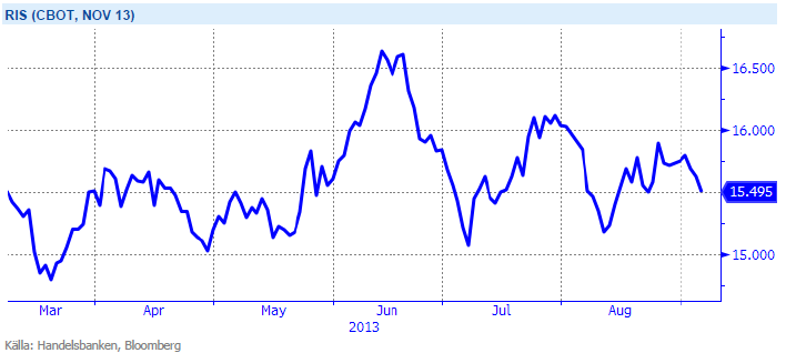 En annan mjuk råvara som haft ett volatilt år är ris. Underliggande terminen till SHB Rice är Rough Rice som handlas på Chicago börsen och där ett kontrakt motsvarar 2000 CWT (ca 90 kg). De globala lagren på ris väntas stiga till 107,47 miljoner ton för säsong 2013-14 – vilket är i så fall den högsta siffran på 12 år. Förväntningarna på den kommande globala risproduktionen för säsong 2013-14 visar på en ökning med 1,9 procent från tidigare säsong, enligt den senaste rapporten från amerikanska jordbruksdepartementet. Förhållandet mellan utgående lager i förhållande till årlig konsumtion är 22,6 procent. Den höga siffran visar på välfyllda rislager för säsongen varför vi tror på fallande priser.