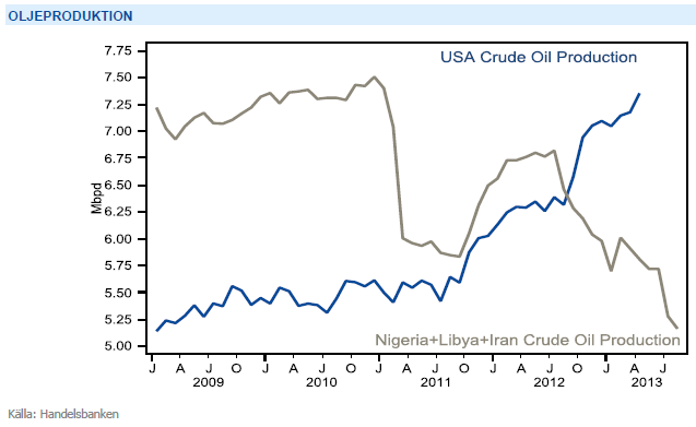 Oljan ligger kvar på höga nivåer där oron för utbudsstörningar i Mellanöstern och sannolikheten att att USA slår tillbaka på al-Assad regimen kvarstår. Buy the rumour sell the fact brukar ju vara en gyllene regel där vi tidigare sett riskpremien pysa ut ganska hastigt efter både Libyen- och Irankonflikten. Även om så sker efter en eventuell intervention, ser vi flera faktorer som kan skrämma upp oljepriset ytterligare. Den globala reservkapaciteten är endast 1.3 miljoner fat per dag och vi ställer oss frågande till om Saudiarabien, som redan idag producerar på rekordnivå, verkligen kan täcka upp för det kraftiga produktionsbortfallet från Nigeria, Libyen och Iran (se bilden nedan). Även Irak har minskat sin produktion de senaste 12 månaderna och denna osäkerhet anser vi väl motiverar nuvarande riskpremie. Lägg därtill positiv amerikansk makrostatistik vilket i kombination med vikande råoljelager för nionde veckan i rad bör skapa en hel del rörelser på uppsidan. Vår rekommendation om lång position kvartsår.