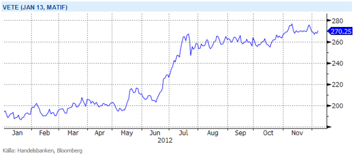 I höstas utlovades det att Sveriges kärnkraftverk skulle gå på full installerad effekt under vintern och därmed minska risken för höga elpriser. I samband med kyla kommer nu även rapporter om stopp i kärnkraftverken och spotpriset. Ringhals 1 är åter i drift efter turbinunderhåll men i Oskarshamn står två av tre reaktorer stilla. Oskarshamn 1 är nere på grund av turbinarbeten, väntas åter i drift i slutet av vecka 50 och Oskarshamn 2 stoppades igår efter krav från Strålsäkerhetsmyndighen att se underhållssituationen på två av sina dieselreservkraftverk, osäkert när reaktorn kan tas i drift igen. Trots gårdagens incident vid oskarshamnsverken har både termins- och spotpriset fallit till idag. Kvartalskontraktet, Q1 2013 (som är underliggande till SHB POWER), har stigit med 2 % under veckan, men faller under senare delen då väderprognoser talar för mildare temperaturer. Med fortsatt energiöverskott behåller vi en neutral syn för elpriset. Från och med måndag är underliggande till SHB POWER kvartalskontraktet Q2 2013, även kallat vårflodskontraktet.