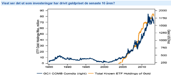 Om vi börjar med guru-resonemanget, d.v.s. ingen tror på guldet, alltså ska det stiga (minsta motståndets lag). Detta gäller ENBART om ”allas” positioner reflekterar den rådande vyn, det är alltför förenklande att bara lyssna på folks åsikter för att avgöra vad som är den ”motsatta” vyn (the contrarian). Det vi ser i våra flöden indikerar inte alls att folk sålt ut sitt guld. Att vara contrarian just nu är kanske inte att tro på en nedgång, utan kanske att tro på en riktigt rejäl nedgång? Vad är rätt värde på guld? Det vi vet när det gäller guld är att ingen ”behöver” guld på samma sätt som vi behöver olja, koppar, spannmål och så vidare, utan vi har guld som en värdebevarare. Det innebär att värdet sätts enligt principen ”tavelvärdering”, dvs. värdet är vad nästa köpare är beredd att betala. Om alla skulle bestämma sig för att det inte är värt dagens pris, då finns det inget ”golv” för priset på det sätt som det finns i andra råvaror, där det oftast utgörs av marginalkostnaden för ny produktion. Så, hur långt kan det falla om det börjar falla på riktigt? Vi vet inte, men det värt att påminna om att för tio år sedan kostade ett uns drygt 300 dollar, idag kostar det strax under 1 600 dollar. Och guldet är likadant idag som då, och allt guld som utvunnits sedan dess finns fortfarande. Vilket för övrigt gäller allt guld som någonsin utvunnits.