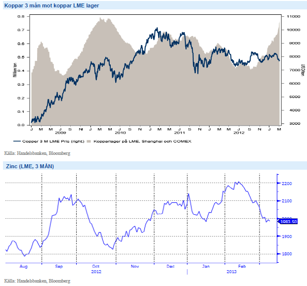 Under första veckan i mars är zink och aluminium de basmetaller som fortsatt vara svaga medan nickel och koppar visat på svag styrka. Under de senaste tre månaderna har lagren för koppar klättrat till toppnivåerna efter finanskrisen. Vi tror att basmetallerna kommer konsolideras för att söka ny riktning efter senaste raset under februari.