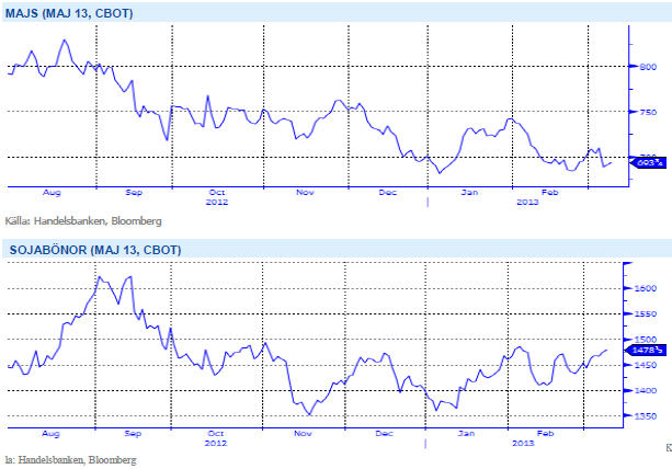 Priserna på sojabönor i Chicago noteras upp något sedan förra veckan, delvis fortsatt påverkat av stark amerikansk export. I Brasilien fortsätter skörden utan större problem. I bland annat regionerna Bahia och Mato Grosso Do Sul är avkastningen lite lägre än väntat och produktionsnivån för Sydamerika bör justeras ned i dagens WASDE-rapport. Rapporten bör även innehålla nedjusterade lagersiffror för USA som följd av den alltjämt starka exporten. Stark efterfrågan och låga lagernivåer ger stöd och på kort sikt är det svårt att se en nedsida för sojan. Faller USDA:s prognos väl in för årets skörd i USA lär vi dock få se klart lägre priser längre fram på året, grödan ska dock först sås och mycket kan hända innan skörd.