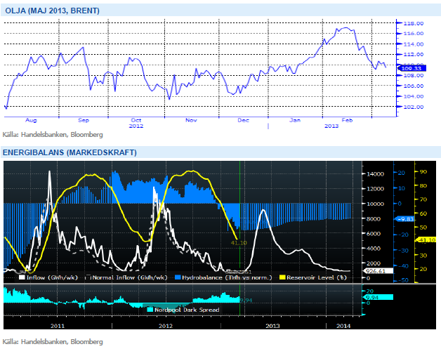Stilla på elmarknaden även denna vecka där kontraktet Q2 2013 handlas upp 0.4 procent. Vikande kol och utsläppsrätter balanseras av torrare och kallare väderprognoser. Efter en period med 1.5TWh nederbörd över normalt i Norden ser det åter lite värre ut för den totala energibalansen som p.g.a. ett högtrycksbetonat väder nu förväntas landa på ca -15,7 TWh mot slutet av nästa vecka, vilket kan ge bra skjuts till elpriset. Vi ligger kvar med en neutral syn. I övrigt rullar vi idag över från Q2 till Q3 kontraktet i SHB Power Index.