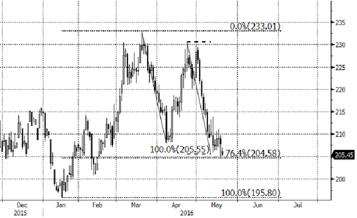 Ett möjligt tecken på att detta synsätt kan vara korrekt vore om koppar skulle handla upp och överskrida någon av sina senaste mindre toppar. De nivåer vi tittar på är 211 alternativt lite mer konservativt 214. Om tanken på förnyad uppgång visar sig korrekt ser vi ett första mål vid 240, där den rörelsen skulle vara lika stor som den tidigare uppgången. En stopp kunde lämpligen placeras under senaste botten, kring 205 som det ser ut just nu.