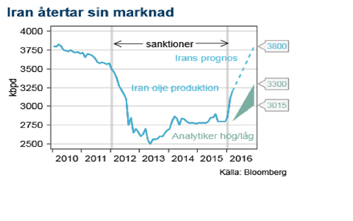 Vi tror att Iran först måste återta sin fulla produktion och att USA:s skifferindustri måste bli iskall före en sänkning av produktionen kan bli aktuell för OPEC. Om OPEC sänker nu kommer skifferindustrin åter kunna öka produktionen med lånefinansierad tillväxt. Det kan dock ändå finnas ett syfte för OPEC att komma överrens om att frysa produktionen. Det skulle bereda marken inför en framtida sänkning av produktionen. Som läget är nu finns ingen produktionskvot att utgå ifrån vid produktionsjusteringar då denna övergavs vid det senaste OPEC-mötet i december 2015.