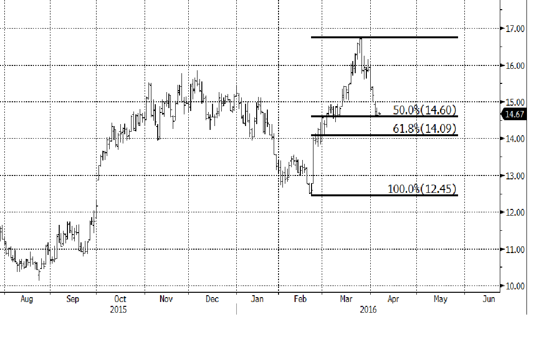 Vi har tidigare skrivit om uppsidan i socker, men marknaden rusade iväg från oss. Socker har nu gjort en större rörelse ned. Vi ser detta som en rekyl på uppgången, och socker har kommit ner till nivåer där det vore möjligt att se den vända upp igen. Vi bevakar socker för tecken på vändning runt dagens nivåer på 14,70, alternativt ner mot nästa möjliga stödområde kring 14,10. Första mål om detta scenario är korrekt är senaste topparna kring 17.