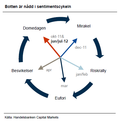 Vi hittar mycket som talar för att vi är nära botten i sentimentcykeln. Det ser alltid som mörkast ut när det vänder. Efter att Spanien sökt nödlån för sina banker och Ny Demokrati vunnit valet i Grekland så är de två största eventriskerna i Europa undanröjda för ett tag framöver.