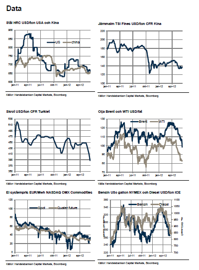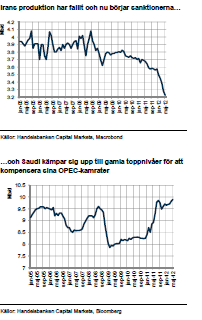 Kina kompenserar för fallande efterfrågan i Europa och USA och Japan ersätter den nedlagda kärnkraften med oljeeldade kraftverk. Därtill kommer sanktionerna mot Iran nu att inträda rent fysiskt från 01 juli. Trots de svagare makroutsikterna sänker vi därför inte den globala efterfrågan, skulle överproduktionen hålla i sig kommer OPEC att minska ganska snart. Därför tror vi att priserna kommer hämta sig från nedtryckta nivåer med en prognos på 110 dollar för andra halvåret 2012.
