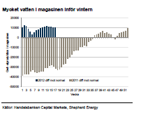 Den milda vintern med en blöt vår har gjort att vattenmagasinen är välfyllda inför den kalla perioden. Kolpriserna driver marginalkostnaden för produktionen under vintern. Idag handlas Q4an kring priset då kolkraften kopplas in vilket betyder att kolkraften snabbt kommer in i prisbilden om sommaren blir torr och vattenreserverna krymper eller om underhållsperioden för någon av kärnreaktorerna förlängs. Omvänt kommer priset att falla om sommaren blir blöt och bibehåller höga vattennivåer i magasinen. Båda scenarierna är svåra att sia om (det finns ingen statistiskt säkerställd väderprognos som varar längre än 5-6 dagar). I år föreligger inte samma höga risk för bortfall från kärnkraften då man skjutit de omfattande planerna att höja kapaciteten i vissa reaktorer.