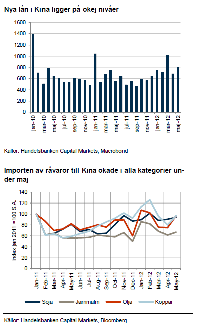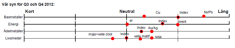 Med osäkerhet i Kina, Europa och kommande osäkerhet i USA inför sparprogrammen efter valet i november så söker vi inte gamla toppnivåer för råvarorna. Från nuvarande nivåer finns det emellertid mycket som talar för uppgång. Råvarorna kommer dock fortsätta åka i baksätet med makro och risksentiment i framsätet och därför tror vi att en bra strategi för de kommande månaderna är att köpa under de svagaste dagarna och sälja när priserna rallat. Den här strategin håller vi fast vid tills Kina fått fotfäste och/eller det kommer (o)väntad stimulans från Europa och/eller USA.