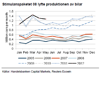 Sedan i mars har vi argumenterat för att basmetaller skulle falla baserat på att Kinas ekonomi skulle bromsa mer än väntat. Det är fortfarande för tidigt att dra tunga växlar på konjunkturåterhämtning och att priserna kommer stiga dramatiskt men vi tror att nedsidan är begränsad från dessa nivåer och med den draghjälp Kinas konjunktur får från stimulanser sedan i maj. Efter några månader med klart sämre data än väntat så vände importen av järnmalm, olja, koppar och sojabönor upp under maj. Det säger inte så mycket om efterfrågan som att likviditeten slutligen har börjat öka efter de tre sänkningarna av reservkraven som gjorts sedan november och nu senast även en räntesänkning. Det kan också betyda att lager har betats av och att Kina står inför att fylla på lagerkedjan igen. Nya lån har legat på bra nivåer hela året och garanterat kredittillväxt, samtidigt har inflationen pressats ner av den sämre konjunkturen och håller inte längre tillbaka stimulanser på samma vis som tidigare. Vi förväntade oss inget stimulanspaket likt det som kom 2008 och gör det fortfarande inte. Fastighetsmarknaden kommer också att vara fortsatt pressad och politiker fortsätter säga att de vill se lägre priser på fastigheter. De stimulanser som kommit har förhållandevis varit tyngre viktade mot konsumtionsvaror (hushållsmaskiner och bilar) jämfört med 2008. Det betyder relativt mer nickel och bly och relativt mindre stål, koppar och zink jämfört med paketet som kom 2008. Förra paketet lyfte bilproduktionen rejält och vi förväntar oss fortsatt styrka med stöd av det nya paketet. Bly används numera till 75 % i bilbatterier.