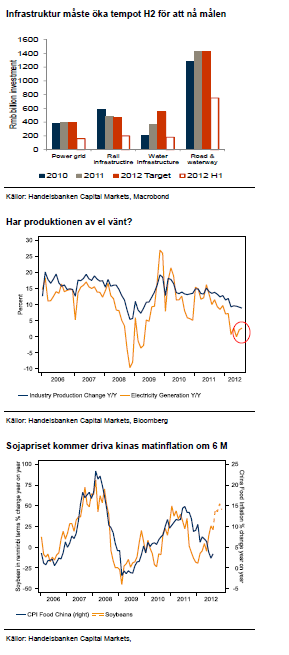 Den kinesiska ekonomin har inte responderat speciellt väl på de stimulanser som har annonserats. Förklaringen är enkel; efterfrågan på krediter är klart lägre och därför får inte centralbankens likviditetsinjektioner lika stor effekt som under tidigare cykler. Vi tänker oss att de kinesiska ledarna har blivit tagna på sängen av den starka inbromsningen, delvis därför att de – som många andra- underskattat eurokrisens styrka och därmed underskattat exportbortfallets påverkan på BNP. Ledarna har helt enkelt hamnat bakom kurvan i ambitionen att styra ekonomin. I kölvattnet ser vi att ytterligare stimulansåtgärder annonserats. Denna gång dock inte i form av ökade krediter utan i form av infrastruktur projekt. Den medicin som fungerade så väl 2009. På längre sikt skapar detta mer av samma problem som man redan har men på kort sikt hjälper det ekonomin att hålla farten uppe.