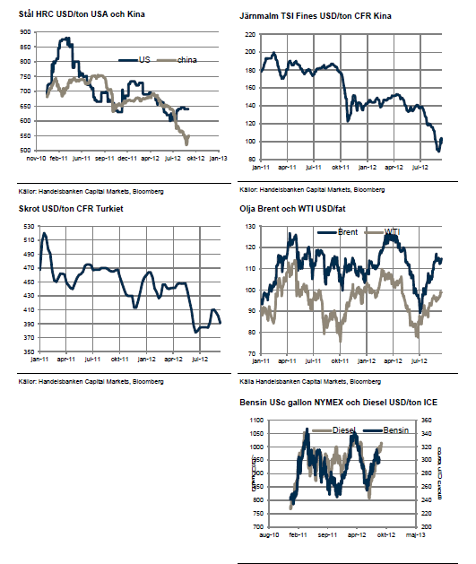 Brent handlas FOB Shetlandsöarna. Utbudsstörningar i Nordsjön har haft en kraftig inverkan på priset under september. Dessa är av tillfällig art, Nordsjön kommer öka med 25 % i oktober och vi ser mer nedsida än uppsida i Brentpriset rent fundamentalt. Att centralbankerna står på gasen väger dock på uppsidan. Vi upprepar vår prognos för H2 på 110 USD.