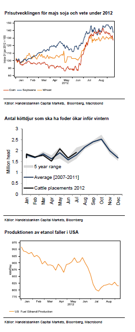 I den senaste rapporten från amerikanska jordbruksdepartementet fanns dock få justeringar för vete, soja och majs. Vi tror nu att det mesta från den fundamentala bilden kring årets skörd är känt och marknaden för soja börjar se ”toppig” ut med minskande export de senaste veckorna, trots det har terminerna stigit i pris. Vi tror att priserna kommer vara höga baserat på den strama marknaden men tror att terminskurvan kommer att skifta nedåt.