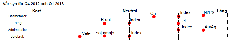 Högre priser på råvaror och nedreviderade utsikter för de stora ekonomierna skapar förnimmelser av en marknad likt ett korthus. Vi lutar oss dock mot att Kina intensifierat stimulansvågen och att centralbankerna åter satt ner foten både genom mycket prat men till slut även handling, viktigast genom QE3. Perioder med lättare penningpolitik har under de senaste åren gett en råvarumarknad som ”glider uppåt”. Med stimulanser i luften tror vi att breda råvaruindex kommer stiga under resten av året. I en sådan miljö, med ett starkare Kina och stimulanspengar i systemet, förväntar vi oss att bas- och ädelmetaller kommer stiga mer än olja och spannmål. Guld har fått styrfart uppåt på utsikterna om frikostig penningpolitik i USA och Europa och vi intensifierar vår tro på ett stigande guldpris.