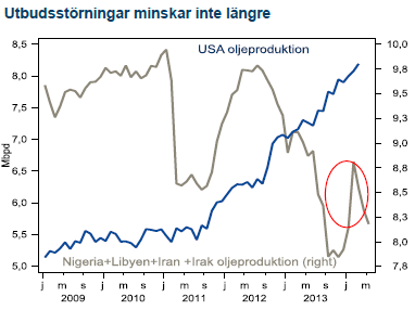 Vårt tema för oljemarknaden under första halvåret var ett prisfall triggat av säsongsmässig svag efterfrågan under Q2 i kombination med stor sannolikhet att utbudsstörningarna skulle minska. Så blev inte fallet. Libyens utsikter att öka exporten har tvärt om försämrats och nu skönjar vi ingen lösning under det här året. Säsongsmässigt går vi nu mot en starkare period med ”driving season” i USA och stora kylbehov i USA och Mellanöstern som ökar oljeanvändningen för att alstra electricitet i Saudi Arabien. Ovanpå dessa faktorer ha konflikten i Irak blossat upp. All erfarenhet talar för att den kommer bli långdragen och påverka oljeexporten. Sammantaget tror vi att prisriskerna svängt från negativa till svagt positiva för nästkommande kvartal. Ett stort frågetecken finns dock kring Irans möjligheter att få börja exportera olja igen. Det vore en ”game changer” som kommer pressa oljepriset. Slutligt avtal ska förhandlas fram till den 20:e juli men det är svårt att bedöma utsikterna för att sanktionerna verkligen hävs. Irans oljeminister har varit offensiv i sina uttalande och sagt att landet börjar trappa upp produktionen i förebyggande syfte