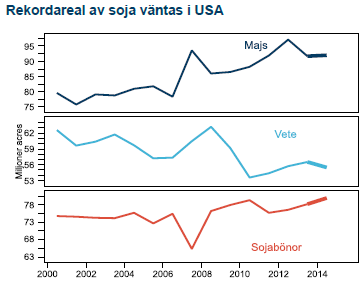 Framförallt i USA har förutsättningarna för årets skörd snabbt förbättrats på sistone. Sojabönor väntas nu ha nära 30 % av en global årskonsumtion i utgående lager efter odlingssäsongen. Majs som varit den mest kritiska grödan av de tre stora efter sviterna av torkan i USA 2012 och den starka efterfrågan till etanolindustrin har tickat upp till flerårshögsta, på nära 20 % av en årskonsumtion. Alla de tre stora är därmed över den kritiska 16 % gränsen (60 dagars konsumtion) då en svag skörd i ett viktigt exportland snabbt kan få priset att stiga.