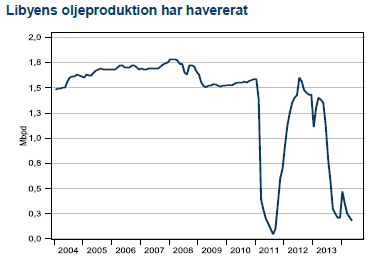 Avsaknaden av en enig regering gör att utsikterna för Libyens återkomst till före krigets nivåer har grusats. Fram till 2011 stod Libyen för 2 % av världens oljeproduktion med 1,6 Mbpd. Sedan dess har exporten varit volatil i spåren av rebellernas försök att försvara möjligheterna att exportera olja från de östra fälten och terminalerna oberoende av Tripoli och för egen vinning.