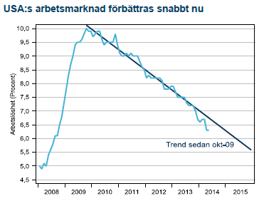 De ekonomiska förutsättningarna i USA är gynnsamma. Företagen är konkurrenskraftiga och exporten kommer troligen fortsätta att vara en faktor som bidrar till en positiv utveckling av investeringar och sysselsättning. Återhämtningen på bostadsmarknaden är stabil och stigande bostadspriser innebär att allt fler hushåll kommer ur den tidigare så förlamande skuldfällan. De offentliga finanserna har förbättrats radikalt vilket innebär att finanspolitiken inte längre behöver vara så restriktiv. Eftersom arbetslösheten är på väg mot normala nivåer tror vi på en första höjning av styrräntan före årsskiftet. Detta innebär att Fed troligen ökar takten i nedskalningen i en snabbare takt, från nuvarande 10 miljarder per möte till 15 för att därmed vara klara i slutet av sommaren. Marknaden prissätter första räntehöjningen i mitten av 2015 och med vårt scenario kommer första räntehöjningen redan i december. Det är alltså enbart en tidsfråga före Fed blir mer ”hökig” i våra ögon.