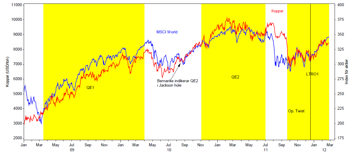 Den 29 februari kl 11:15 kommer ECB med en andra 3-års repa. Den första repan i december hade en imponerande storlek, 489 mdr, och fick en imponerande effekt på riskhandlade tillgångar på de finansiella marknaderna. I grafen ovan ses hur världsindex för börsen och koppar handlats hand i hand på stimulans från centralbanker sedan våren 2009. I perioder utan stimulans har sedan korrektioner kommit när fokus åter varit den skuldtyngda realekonomin. I mars förväntar vi oss mer av den stigande trend som vi sett sedan första repan (LTRO1) i december. All erfarenhet talar för att även en väl känd manöver som denna stimulansåtgärd ger positiva marknadsrörelser.