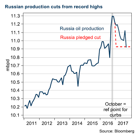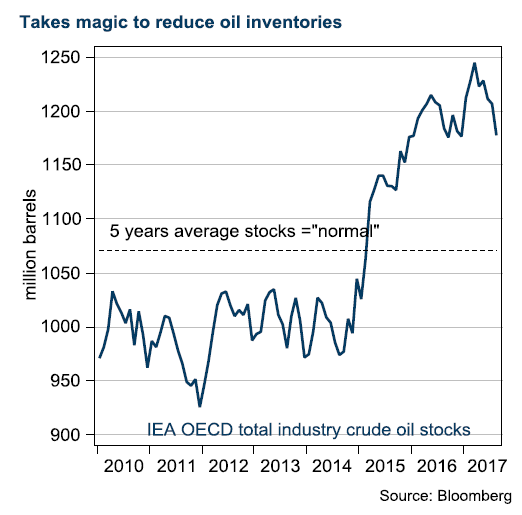Given the impressive compliance, it is striking, in our view, that OPEC is so far from its target of draining global stocks. Inventories are lower, but we believe the strong seasonal effect of the US driving season this year is the key factor behind that. The target should have been reached in May, but will not be reached by the November meeting, and it would be surprising if normal stock levels were reached before OPEC’s spring meeting in May/June 2018.
