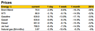 In the US, on the other hand, there could well be a supply reaction in the foreseeable future. According to industry data provider Drilling Info and Reuters, the number of approved oil and gas wells plunged by 40% in November. In the three main shale oil formations – Permian Basin, Eagle Ford and Bakken – numbers declined by between 38% and just below 30%. This is likely to result in a lower rig count after a delay of some months. Because shale oil production in each rig declines by an estimated 60%-70% during the first year after production commences, this will probably have a visible impact on US oil production in the second half of 2015, though this will do little to reduce the oversupply envisaged in the first half of 2015.