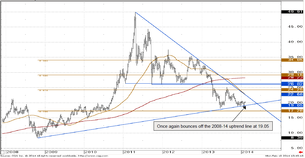 - The silver price slipped to 18.99 in late January from where it reversed its short term trend and broke through the 2012- 14 resistance line at 19.82 last week.
